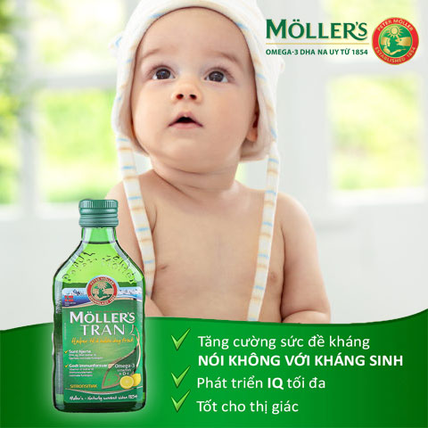 Thực phẩm bảo vệ sức khỏe dầu gan cá Tuyết Moller’s là nguồn cung cấp Omega-3 DHA&EPA tinh khiết, hàm lượng cao nhất thị trường, đáp ứng được với nhu cầu khuyến cáo của tổ chức Y Tế Thế Giới. Ngoài ra, trong mỗi liều dùng 5ml thực phẩm bảo vệ sức khỏe Moller’s Tran chứa 10µg Vitamin D3 (400IU) và 250mcg Vitamin A (833IU) thiết yếu với hệ miễn dịch của trẻ. Để bổ sung những vi chất cần thiết trên, hãy cho trẻ uống thực phẩm bảo vệ sức khỏe Moller’s Tran mỗi ngày. Lưu ý: Thực phẩm này không phải là thuốc, và không có tác dụng thay thế thuốc chữa bệnh.
