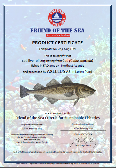 FoS (Friend of the Sea) là chứng nhận danh giá, khẳng định sản phẩm Thực phẩm bảo vệ sức khỏe dầu gan cá tuyết Moller’s có nguồn gốc từ cá tuyết được đánh bắt tại vùng biển phía Bắc Đại Tây Dương và được chế biến bởi AXELLUS AS (ngày nay là Orkla Helath AS). Chứng nhận của FoS khẳng định thương hiệu Moller’s đã cam kết và thực hiện khai thác, sử dụng nguồn nguyên liệu tự nhiên hoàn toàn hợp lý, nghiêm ngặt, giúp bảo vệ môi trường và nguồn sinh thái biển.